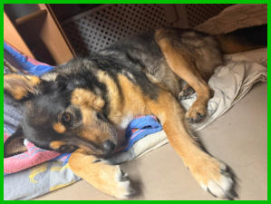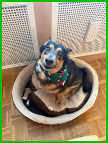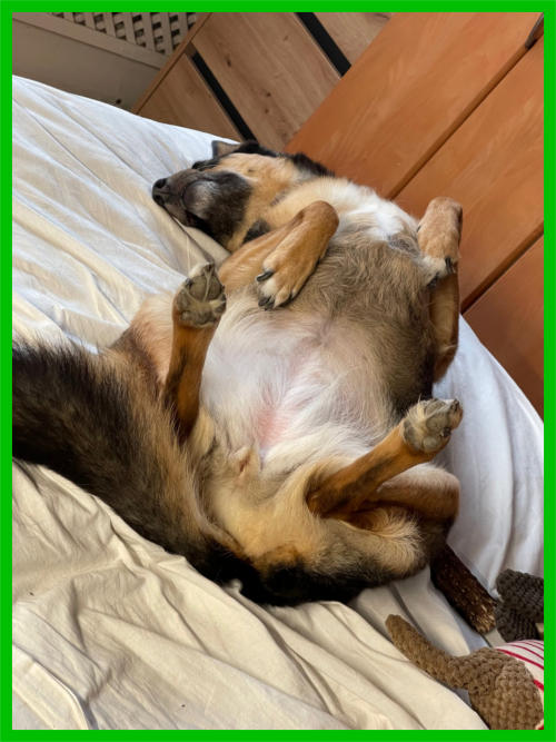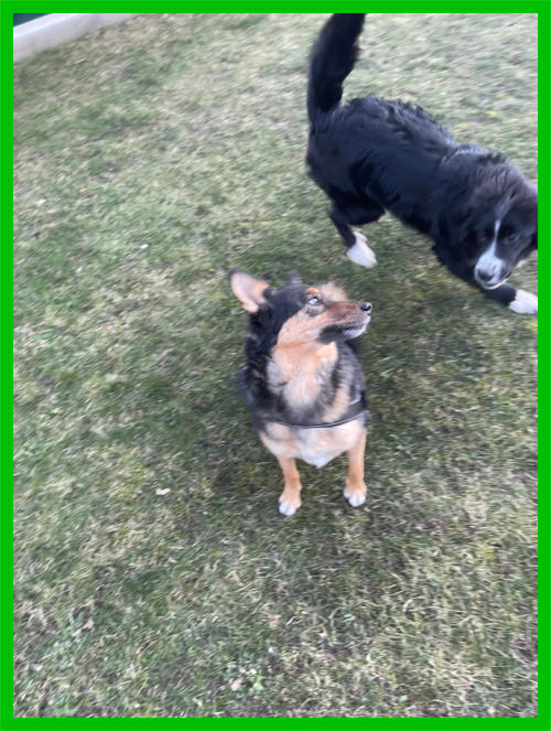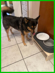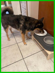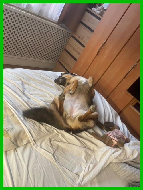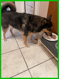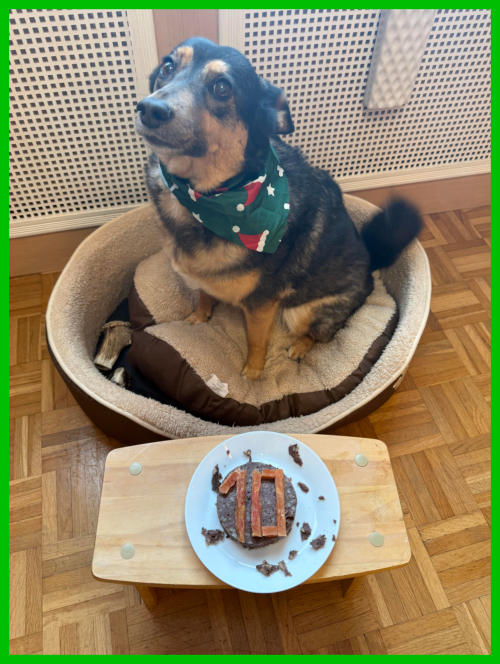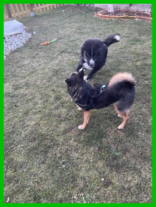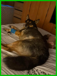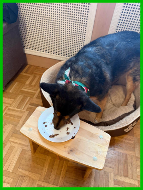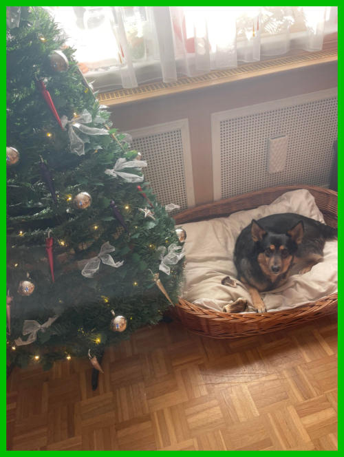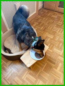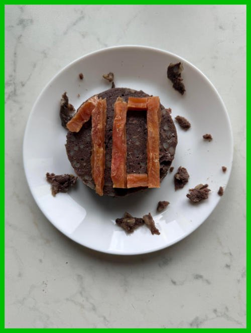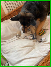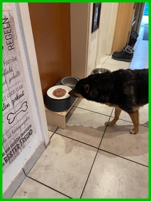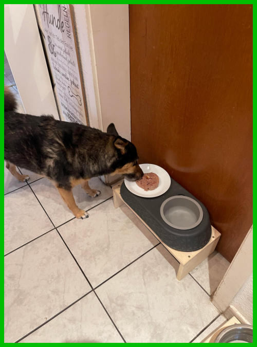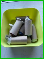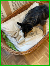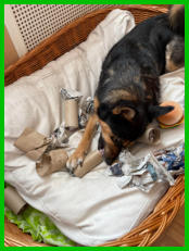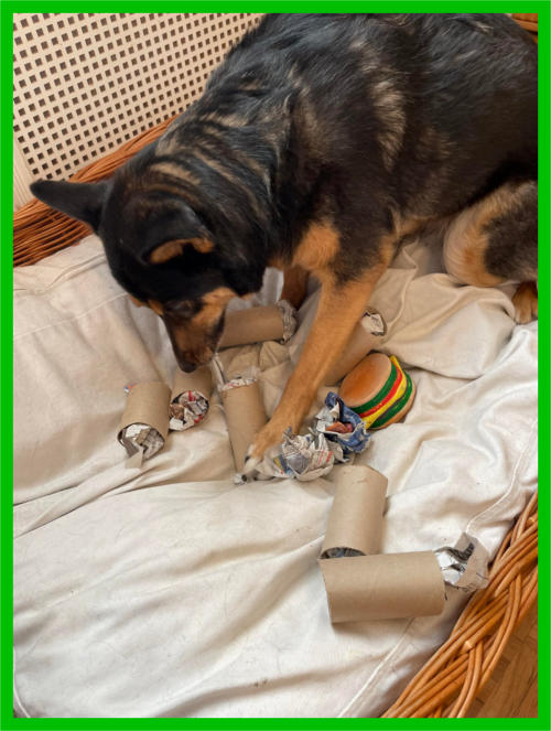 Ab und zu spielt mein Herrl mit mir das Leckerliesuchspiel. Hühnerbruststücke in Klorollen versteckt.